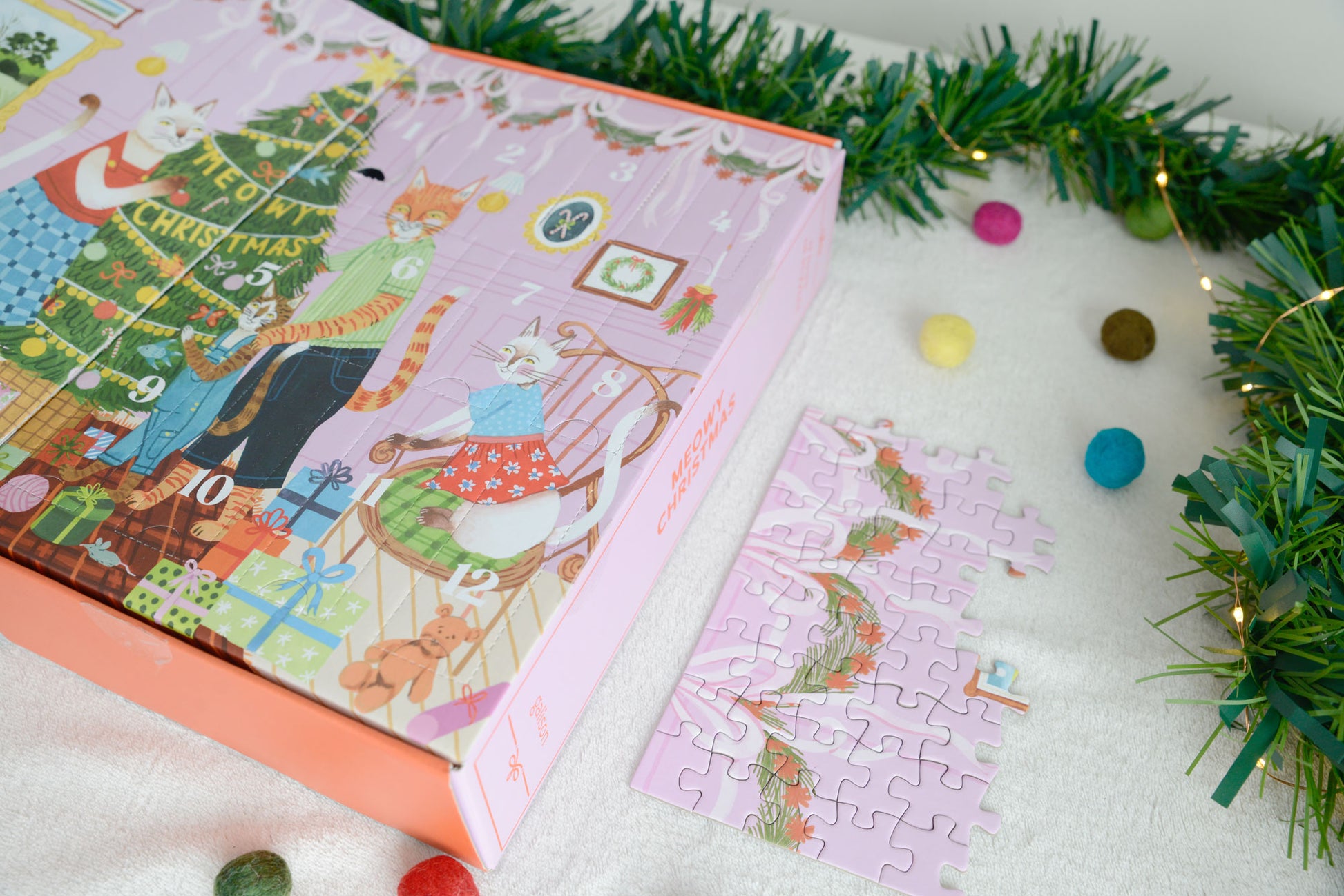 Each day reveals a delightful mini puzzle, which all fit together to create one fully interlocking 500 piece jigsaw of a cosy cat family decorating their Christmas tree.